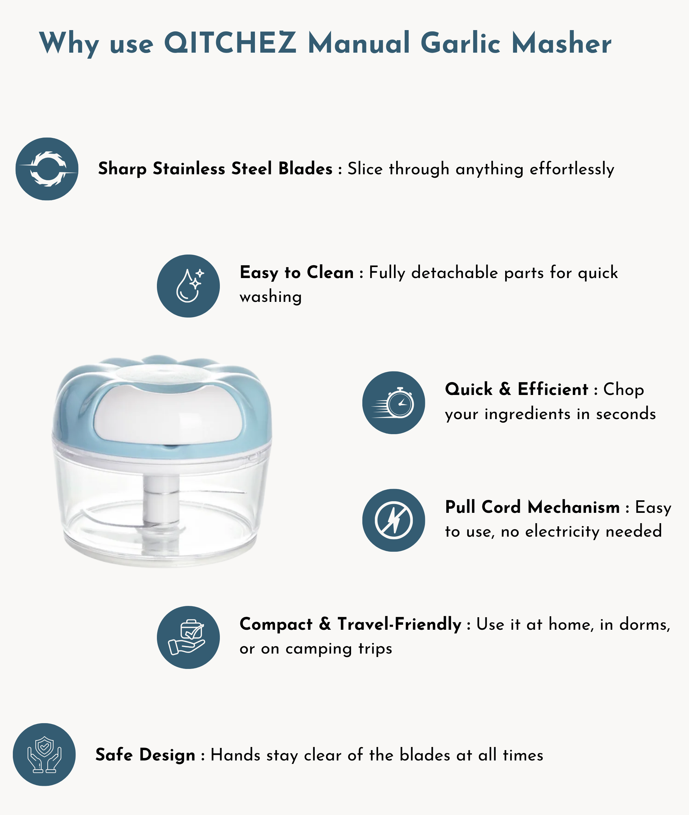 The QITCHEZ Manual Garlic Masher quickly and easily mashes garlic and other vegetables. Its durable stainless steel blade ensures consistent results, while its eco-friendly design supports sustainable cooking. Available in blue and pink, it adds a colorful touch to your kitchen.